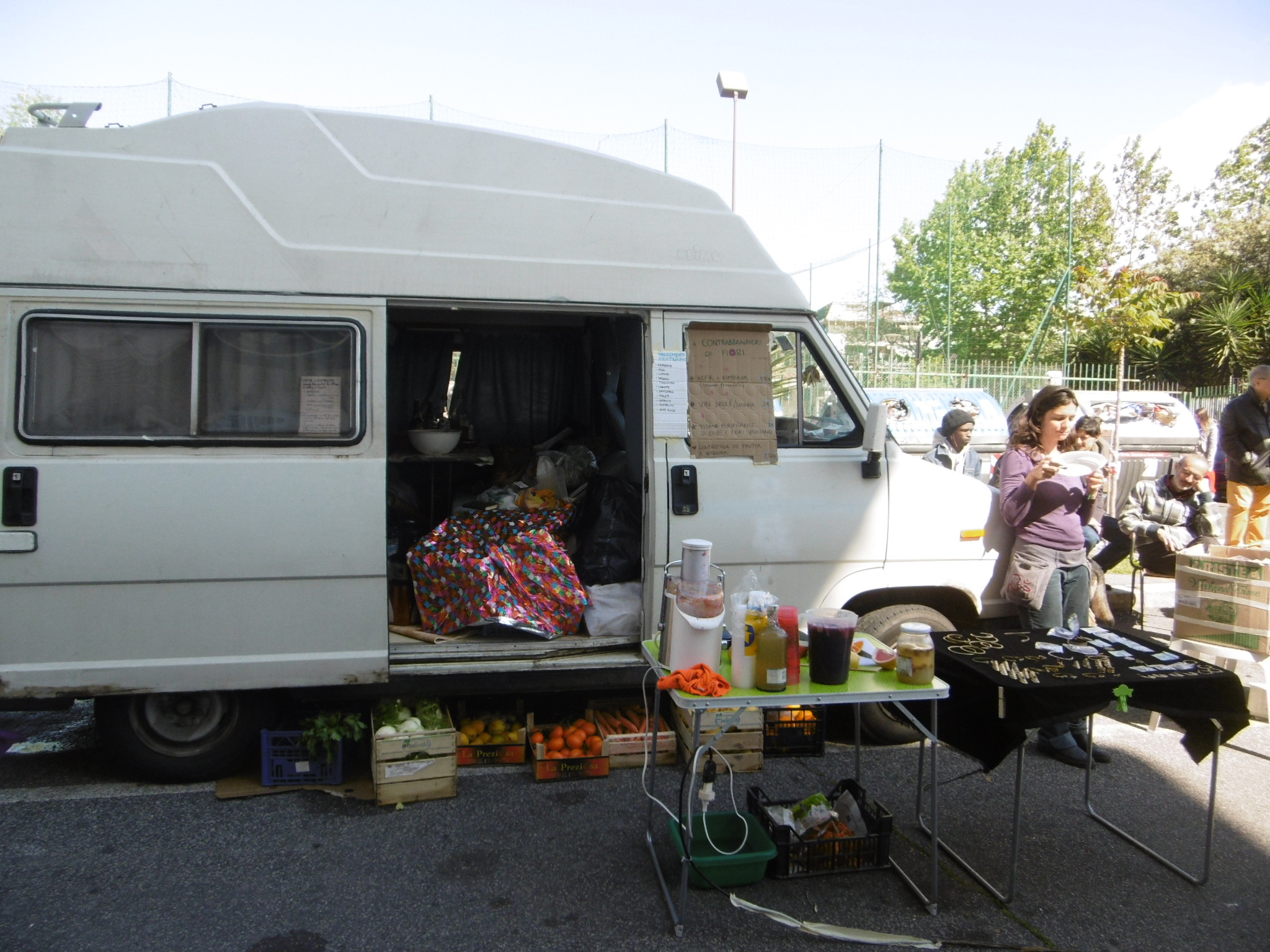 Questa è la dinamica dei fatti. Arriviamo al Pigneto domenica, per andare al mercato di terraTERRA, produttori locali della rete di Genuino Clandestino. Il mercato si tiene in una piazzetta e noi decidiamo di parcheggiarci nelle vicinanze in un posto comodo e, crediamo, tranquillo. E’ l’una di pomeriggio. Dopo tre quarti d’ora passati al mercato, torniamo al furgone per prendere alcune cose. Il posto dove l’avevamo lasciato è vuoto! Disorientamento prima, panico poi. La rabbia si mischia allo sconforto. Avevamo lasciato tutto dentro…